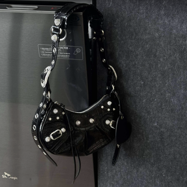 Balenciaga Rhinestones Crocodile Embossed Le Cagole XS Shoulder Bag Black